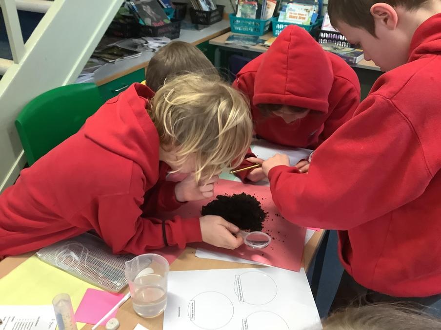 Helvellyn explored soil with magnifying glasses and sieves to find out what it is made of.